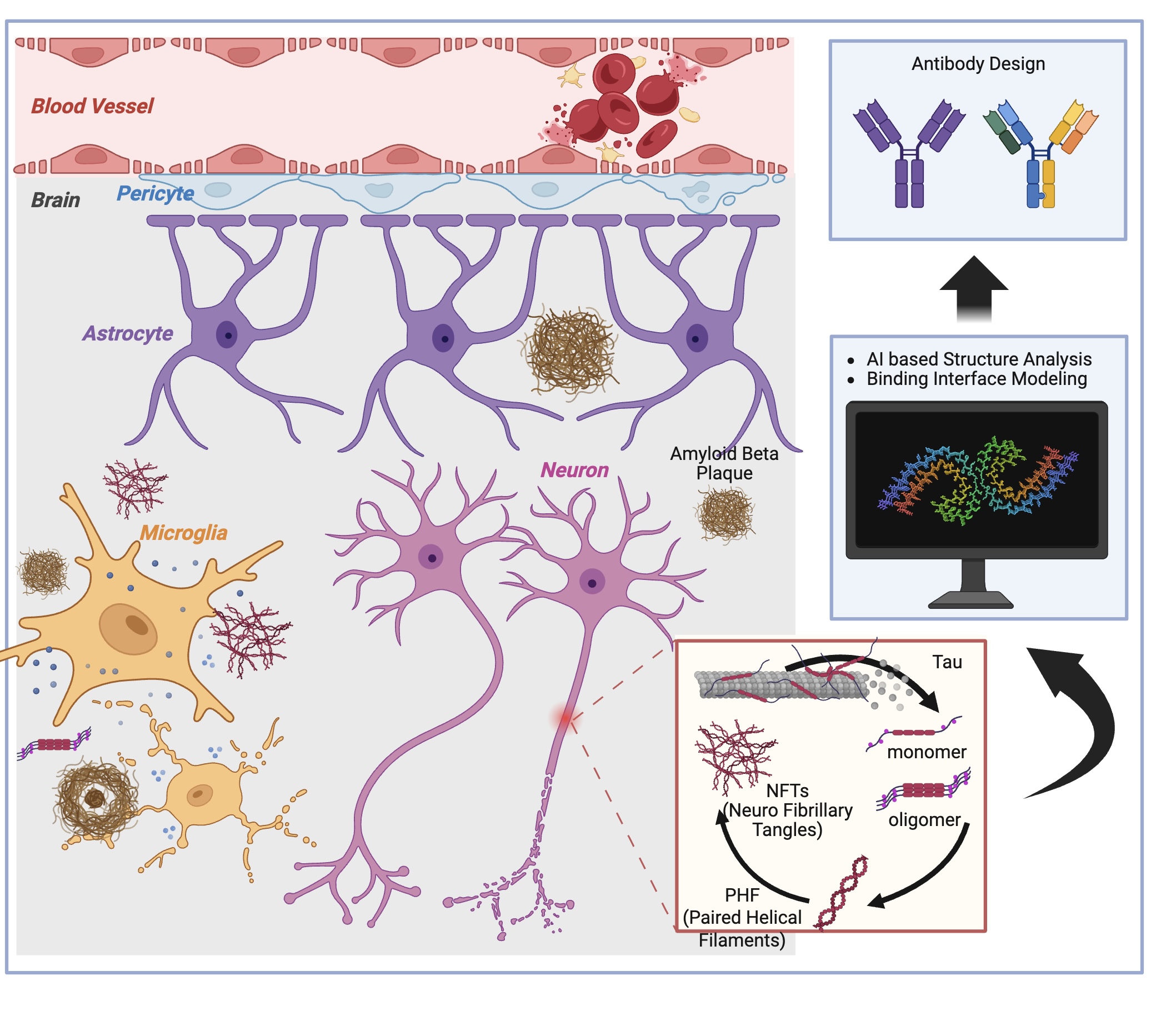 Our research focuses on designing therapeutic strategies targeting the hallmark pathological features of Alzheimer’s disease, namely the abnormal aggregation and intercellular propagation of amyloid-beta and tau proteins. Through AI-driven structure-based analyses, we characterize the structural properties of protein aggregates and develop targeted therapeutic approaches.
